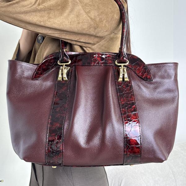 Жіноча сумка з натуральної шкіри в розкішному кольорі марсала поєднує елегантність і практичність. Лаконічний дизайн доповнено лакованими вставками з перфорацією, які надають моделі вишуканого шарму. Два основні відділення розділені центральною кишенею на блискавці, всередині є додаткові кишені — одна на блискавці та одна відкритого типу для зручного розміщення дрібниць. Завдяки довгим ручкам сумку можна носити в руці або на плечі. Цю стильну та функціональну модель ви знайдете у нашому магазині — ідеальний вибір для поціновувачів якості та стилю.