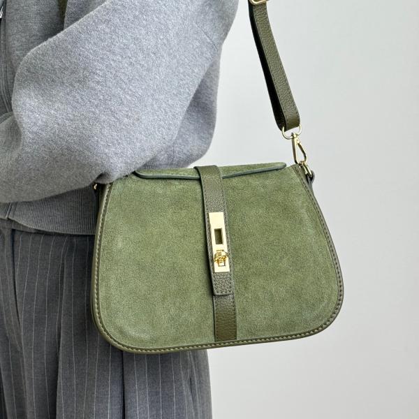 Жіноча сумочка в елегантному оливковому кольорі виконана з натуральної замші та зернистої шкіри, що створює стильне поєднання фактур і додає моделі виразності. Містке основне відділення забезпечує зручність у щоденному використанні, а клапан із поворотним замком гарантує надійне закривання. Золота фурнітура надає сумочці витонченого блиску та завершеного вигляду. У комплекті — знімна коротка ручка й подовжений регульований ремінь, завдяки яким аксесуар можна носити різними способами. Ця сумочка стане чудовим доповненням до вашого гардероба, підкреслюючи бездоганний смак і любов до якісних деталей. Придбати її можна у нашому інтернет-магазині, де поєднуються стиль, комфорт і висока якість.