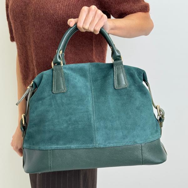 Жіноча сумочка у насиченому смарагдовому кольорі, виконана в елегантному поєднанні натуральної шкіри та замші, стане стильним акцентом вашого образу. Модель має два основні відділення, розділені кишенею на блискавці. Усередині передбачені додаткові кишені — відкрита та на замку, а зовні, на звороті, розташована ще одна кишеня на блискавці для зручного доступу до необхідних речей. Ручки та дно сумки виготовлені з гладкої натуральної шкіри, а основна частина — із м’якої замші, що створює розкішний контраст фактур. Каркасне дно з ніжками допомагає сумочці зберігати форму та виглядати охайно. Бічні ремінці дозволяють регулювати об’єм, додаючи практичності. Золота фурнітура підкреслює елегантність виробу, а довгий регульований ремінь дає змогу носити сумку як у руці, так і на плечі. Придбати цю розкішну модель ви можете у нашому інтернет-магазині — чудовий вибір для жінок, які цінують якість, комфорт і витончений стиль.