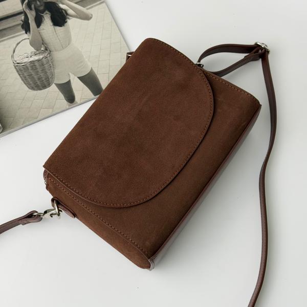 Жіноча сумочка в глибокому шоколадному кольорі, виконана з натуральної м’якої замші, — вишуканий аксесуар, що гармонійно доповнить як повсякденний, так і більш елегантний образ. Оксамитова фактура замші підкреслює благородство відтінку та надає моделі особливого шарму. Сумка має три окремі відділення: два на блискавці для надійного зберігання речей та одне під клапаном із магнітною застібкою для швидкого доступу. Усередині передбачена додаткова кишеня на замку для зручної організації дрібниць. Подовжений регульований ремінь дозволяє комфортно носити модель на плечі або через плече. Придбати цю стильну замшеву сумочку ви можете у нашому магазині — ідеальне поєднання якості, функціональності та елегантності.