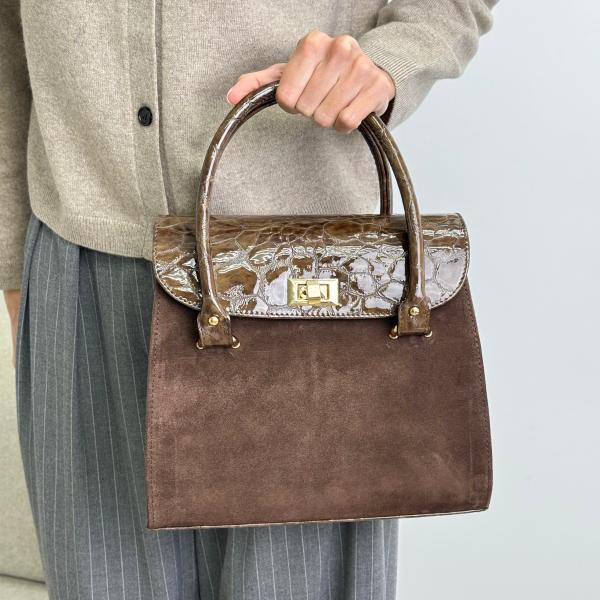 Жіноча сумочка у вишуканому кольорі тауп виконана в поєднанні натуральної замші та лакованої шкіри з оригінальним тисненням. Такий дует матеріалів створює елегантний і водночас сучасний вигляд моделі. Сумочка має два окремі відділення, кожне з яких закривається на блискавку, а додатковий клапан із поворотним замком забезпечує надійність і стильний акцент. Усередині передбачено дві кишені — відкриту та на блискавці, що дозволяють зручно організувати простір. Позаду розташована ще одна зовнішня кишеня на замку. Зручні короткі ручки дають можливість носити сумочку в руці, а подовжений регульований ремінь — на плечі або через плече. Цю елегантну модель ви можете придбати у нашому інтернет-магазині — стильне рішення для жінок, які цінують якість, комфорт і деталі.