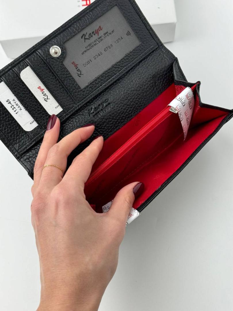 Дуже акуратна і винахідлива модель гаманця з натуральної зернистої шкіри чорного кольору. У гаманці всередині є два відділи для купюр, які розділяє кишеня на блискавці для монет, а також багато додаткових відділень. Гаманець повністю закривається на клапан з міцною кнопкою. Що унікально в нашому гаманці це те, що позаду нього є повноцінне відділення для карт, яке закривається на магнітні кнопки. З ним ви будете все тримати в ідеальному порядку.